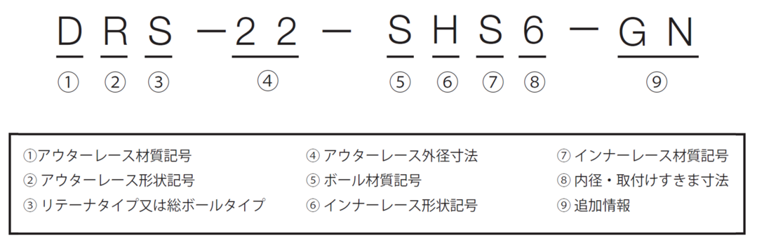 内輪穴タイプは内径を表示し、カシメ軸タイプ、ねじ軸タイプはC 寸法( 円筒長さ) を表示します。