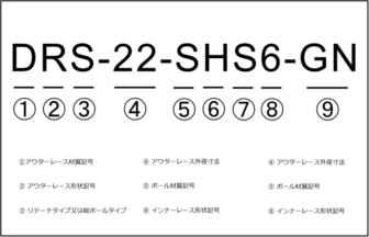 解説①アウターレース材質記号D:アセタール樹脂N:ポリアミド樹脂PE:ポリエチレン樹脂E:導電性樹脂UT:ウレタン樹脂PK:PEE…