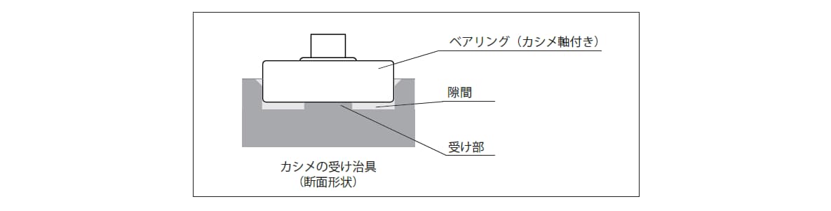 板金へかしめる際の注意点として、かしめの衝撃がアウターレースに加わらないようインナーレースの端面を受け部とすることをお願いしています。これは、アウターレースに衝撃が加わると、ベアリング内部にボールの圧痕がついて回転性能に影響を及ぼす恐れがあるからです。また、カシメ方法はスピンカシメ(※)を推奨します。潰しかしめの場合、かしめ後に軸のひび割れ等の不具合が発生する恐れがあります。※スピンかしめとは、押圧するシャフトが偏角を持った状態で回転しながら押圧してかしめる方法です。
